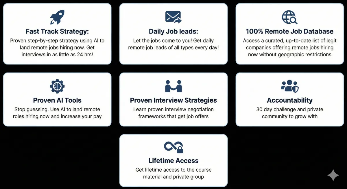 No experience needed! This course is designed for beginners, career transitions, and people returning to work. You’ll learn how to leverage AI, the right tools, and simple strategies to fast-track your remote job interviews and offers. Everything is step-by-step so you can implement right away.